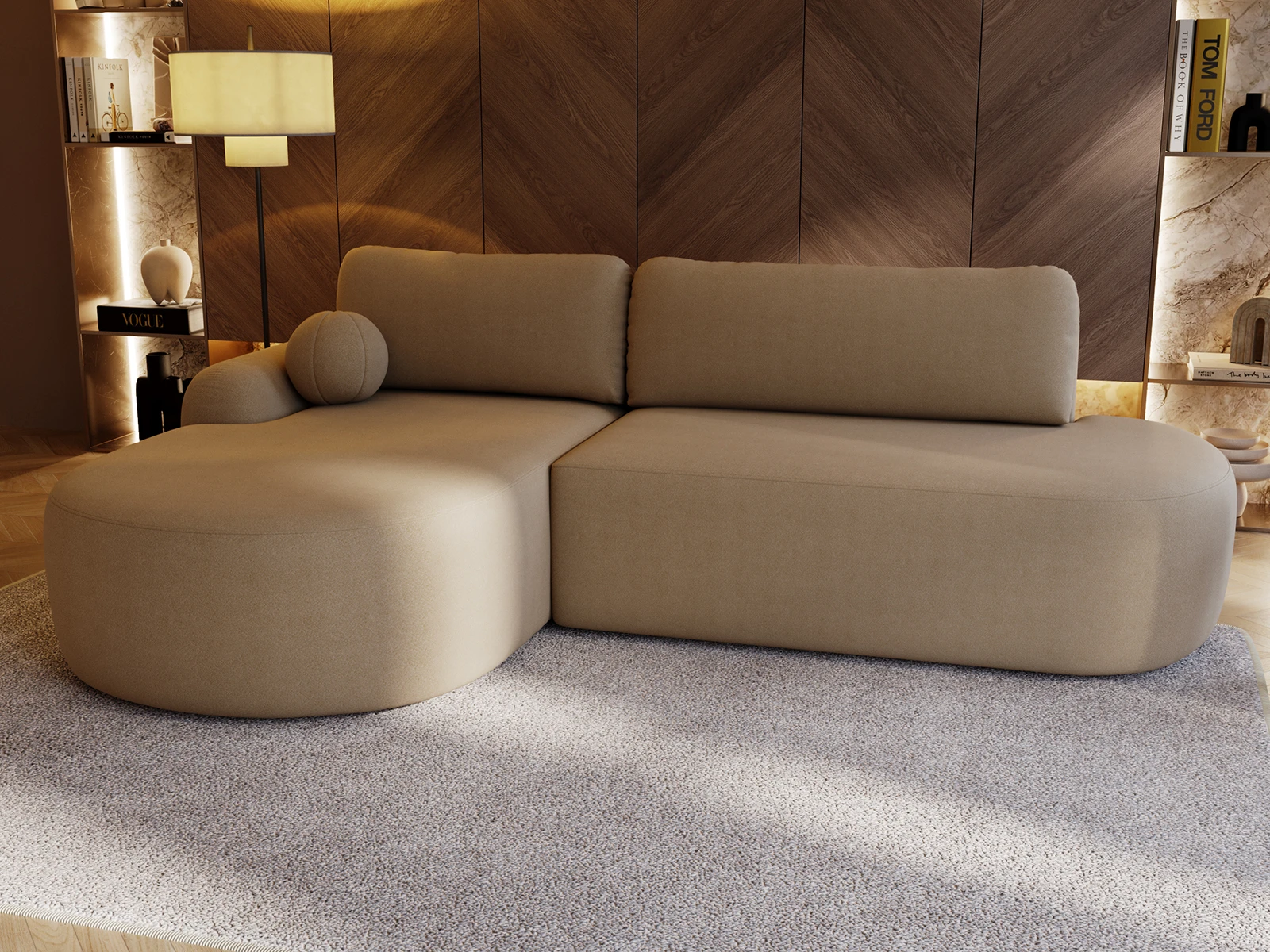Narożnik AGAT O łączy w sobie nowoczesny design, wysoki komfort i funkcjonalność. Zakrzywione linie i minimalistyczna forma nadają pomieszczeniu lekkości i stylu. Miękkie, wypełnione pianką i wzmocnione sprężynami falistymi poduszki zapewniają doskonały komfort siedzenia. Dzięki funkcji spania sofa można szybko przekształcić w wygodne łóżko, a pojemnik na pościel stanowi praktyczne miejsce do przechowywania koców i poduszek – idealne rozwiązanie do nowoczesnych pomieszczeń mieszkalnych.