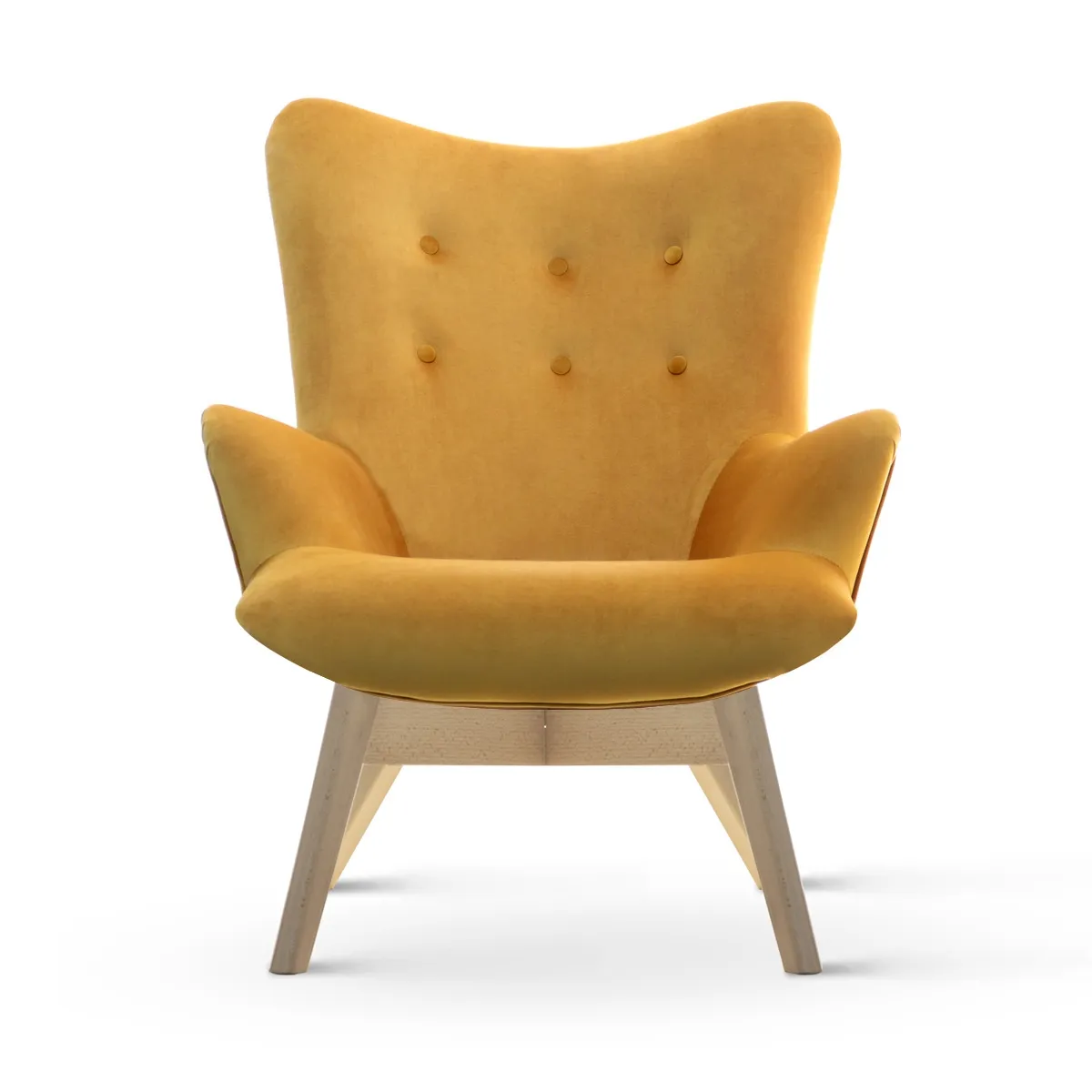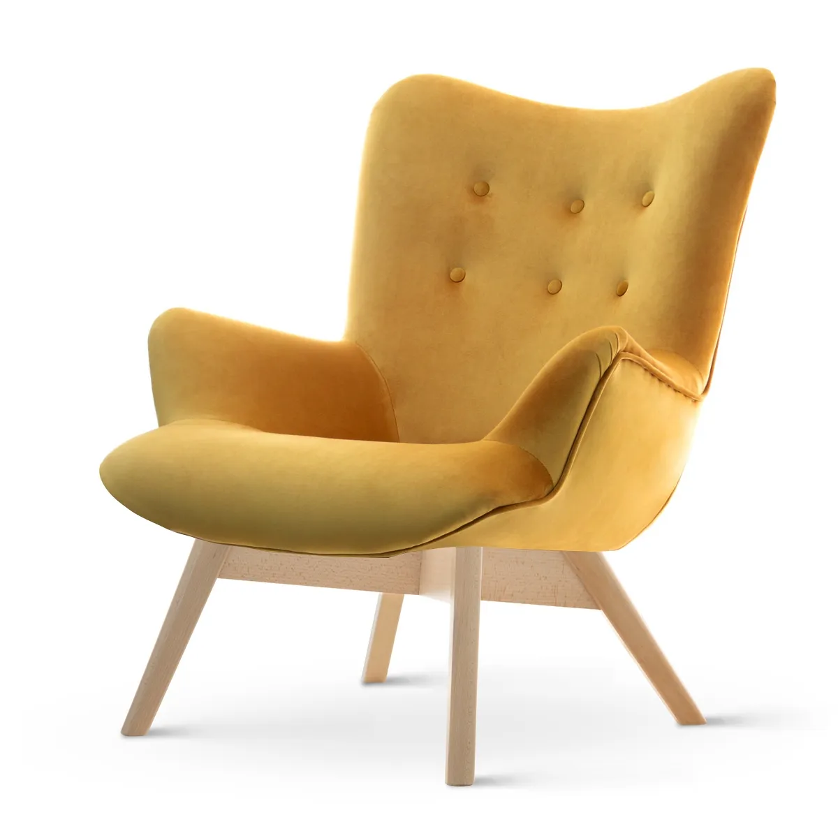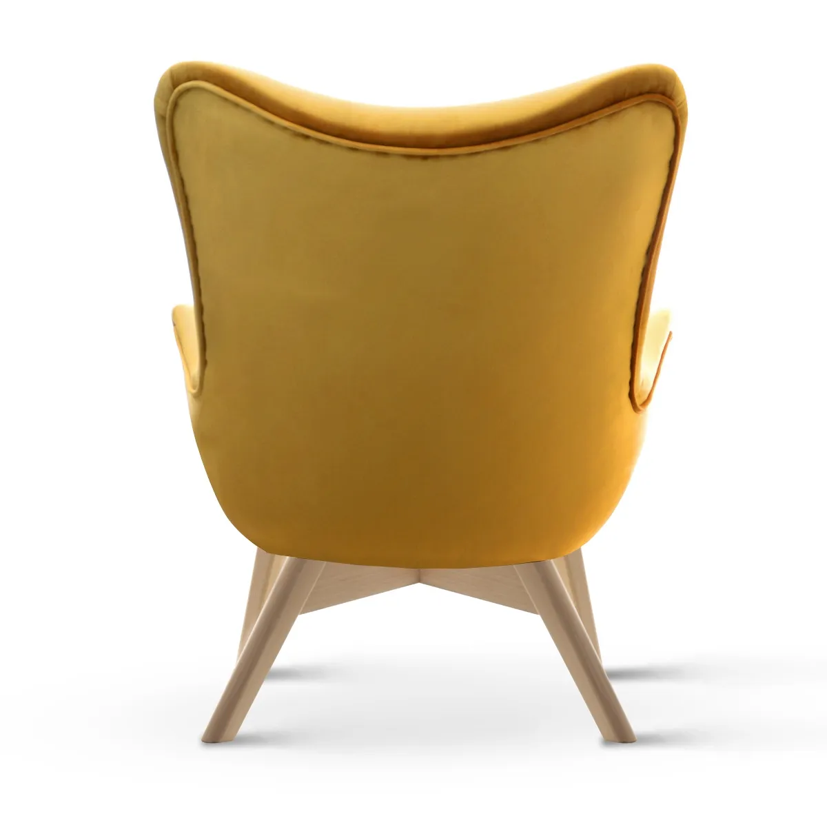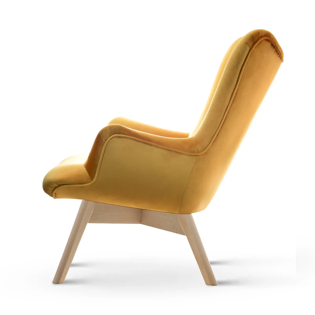 Nowoczesny kształt fotela, z eleganckimi liniami i przemyślaną ergonomią, sprawia, że jest on nie tylko wygodny, ale również stylowy. Solidna drewniana podstawa zapewnia stabilność i trwałość, a jej naturalne wykończenie idealnie komponuje się z miodowym kolorem tapicerki, tworząc harmonijną i estetyczną całość.