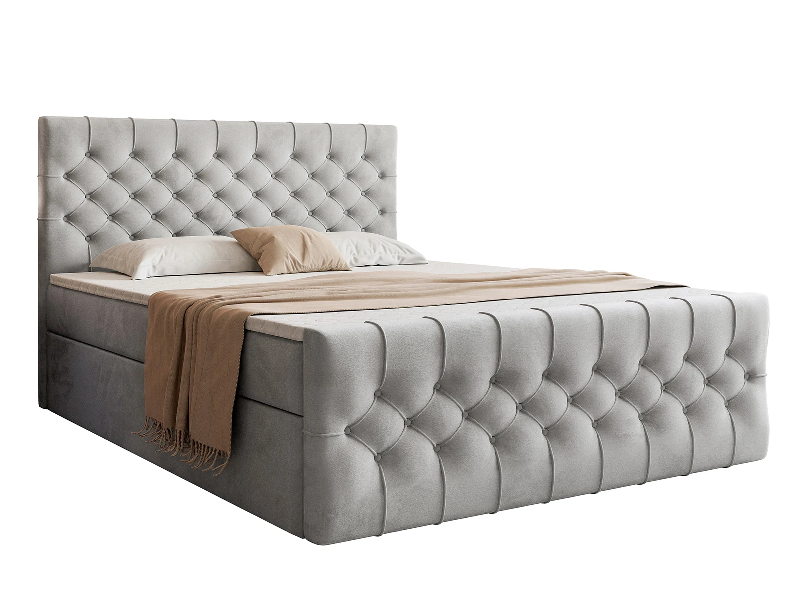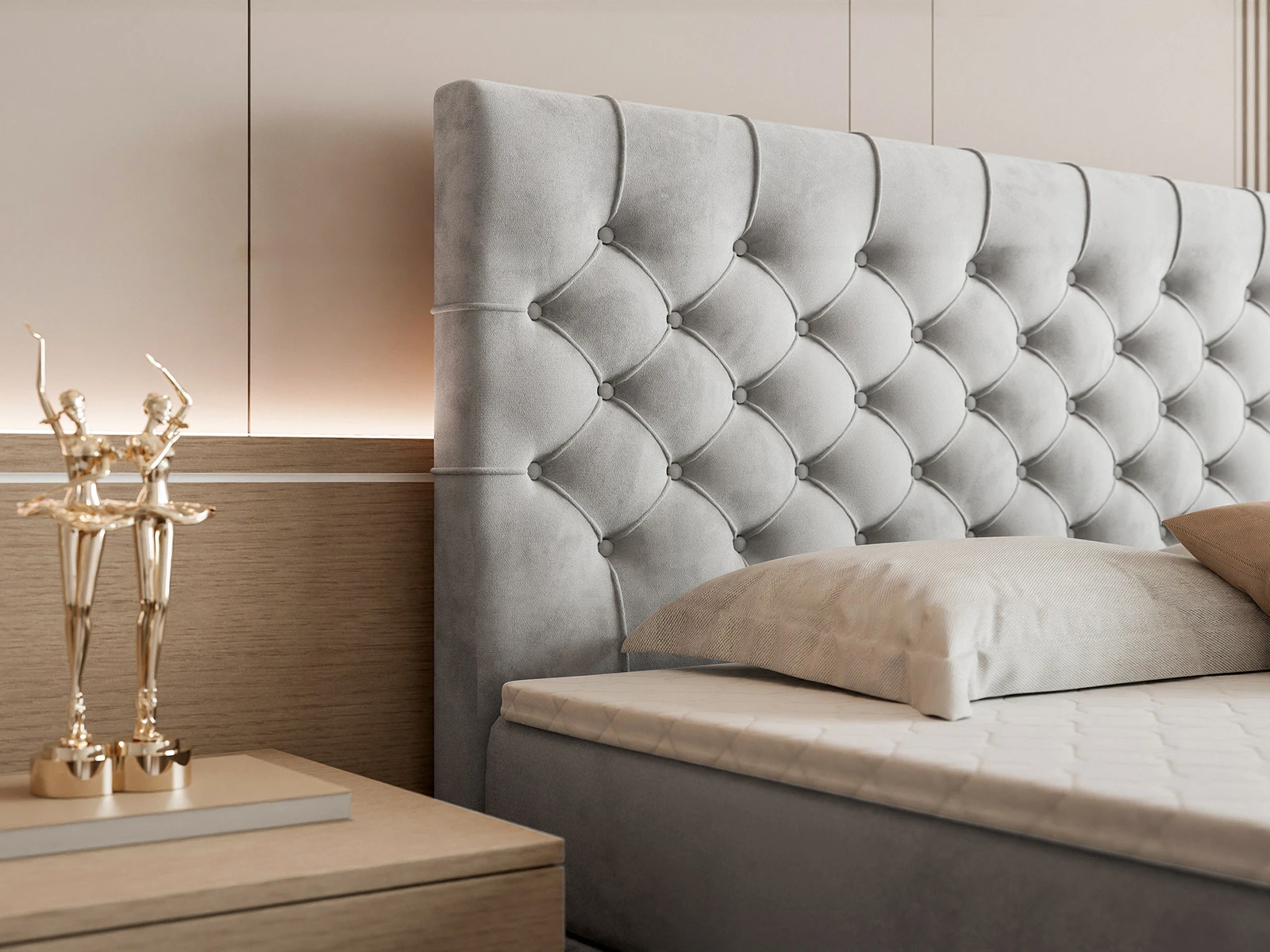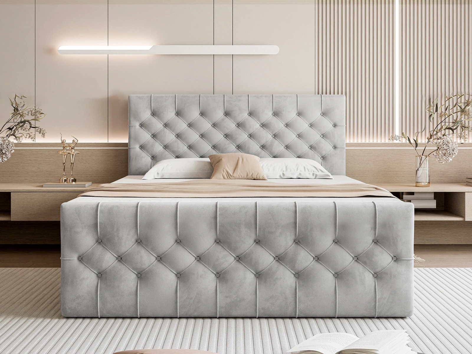 Efektowne, głęboko pikowane wezgłowie oraz front łóżka przyciągają wzrok i podkreślają elegancki charakter mebla, a jednocześnie zapewniają komfortowe oparcie podczas czytania czy relaksu. Solidna konstrukcja gwarantuje stabilność i trwałość na lata, a staranne wykończenie świadczy o wysokiej jakości wykonania.