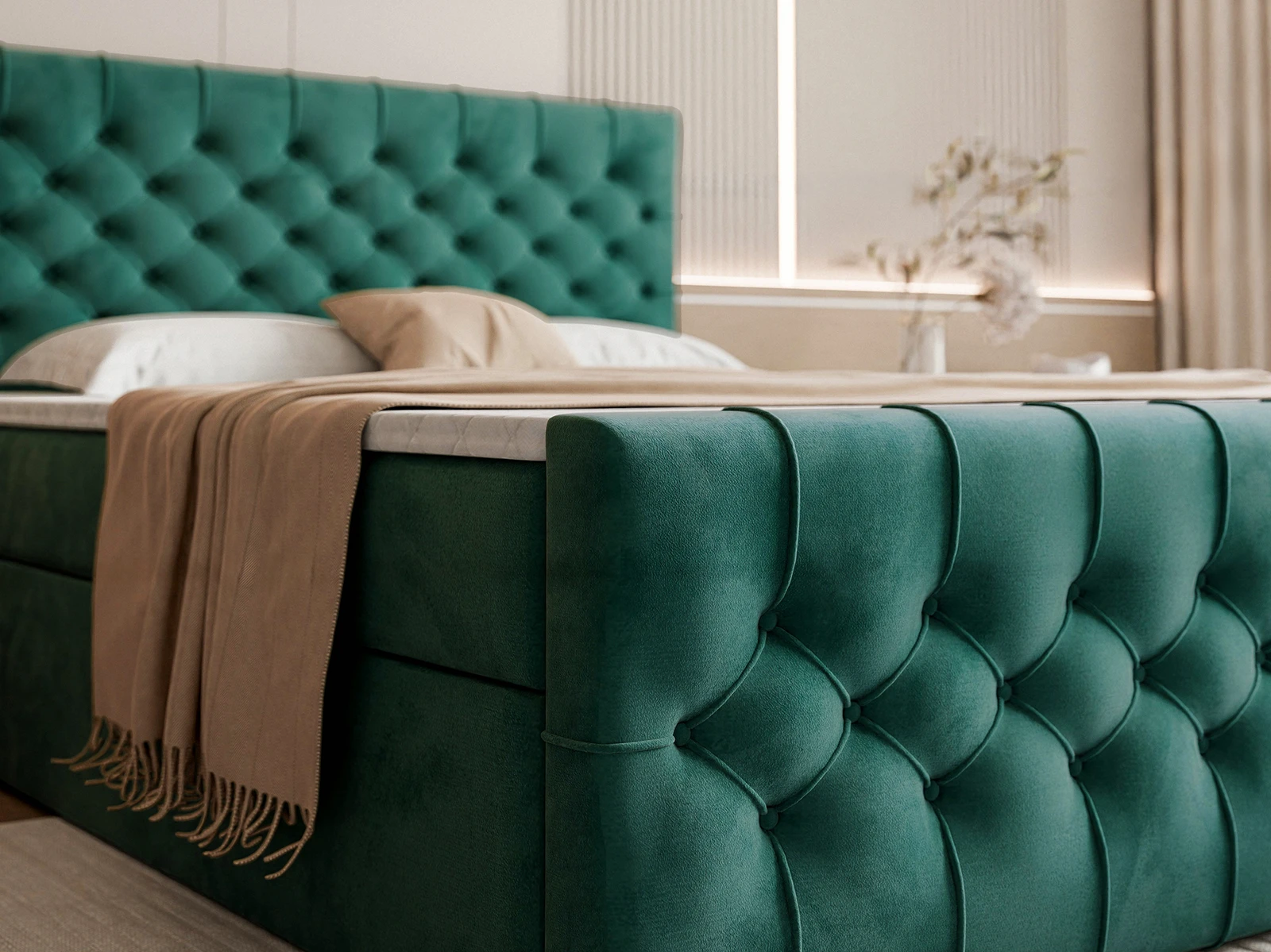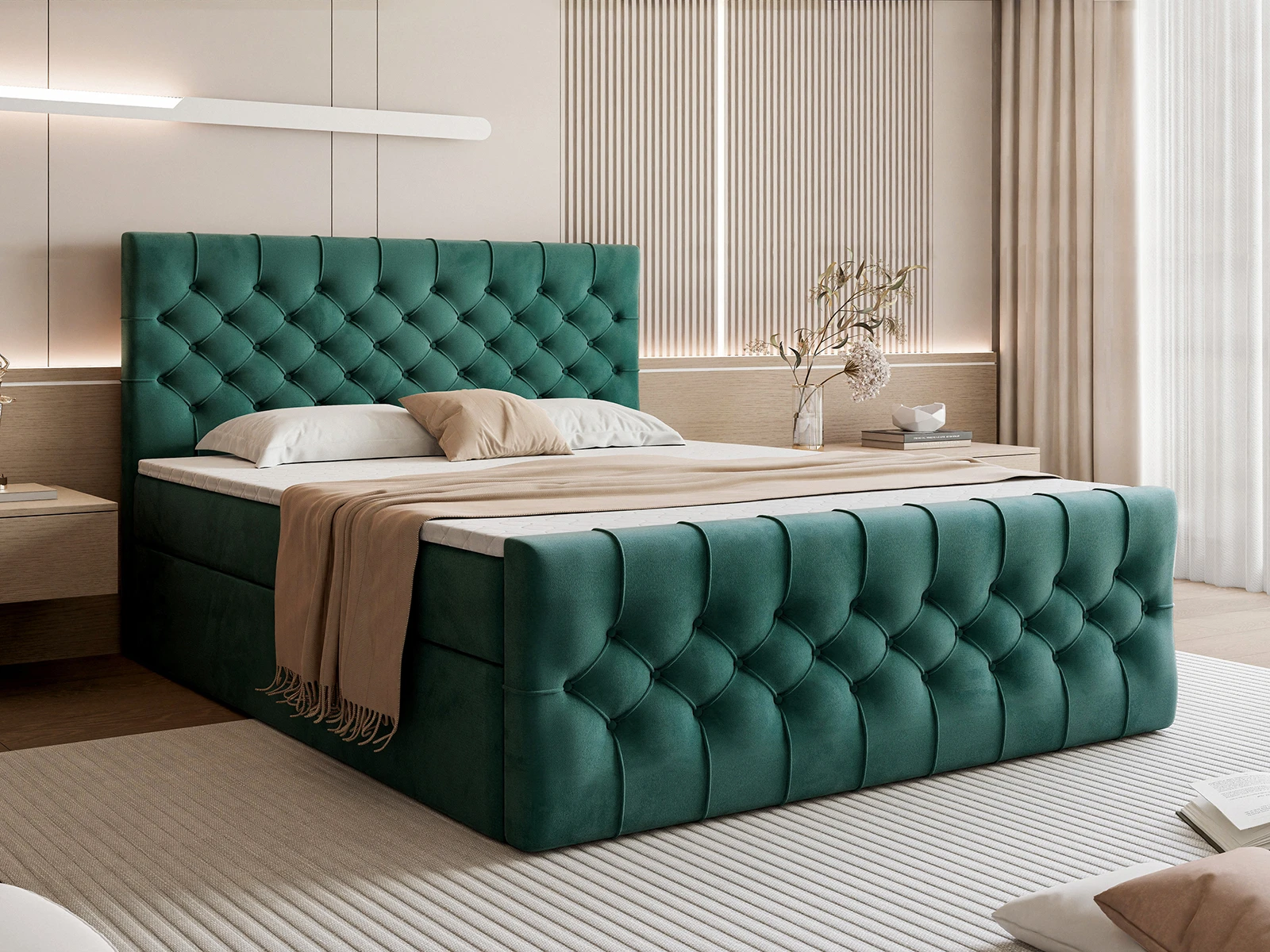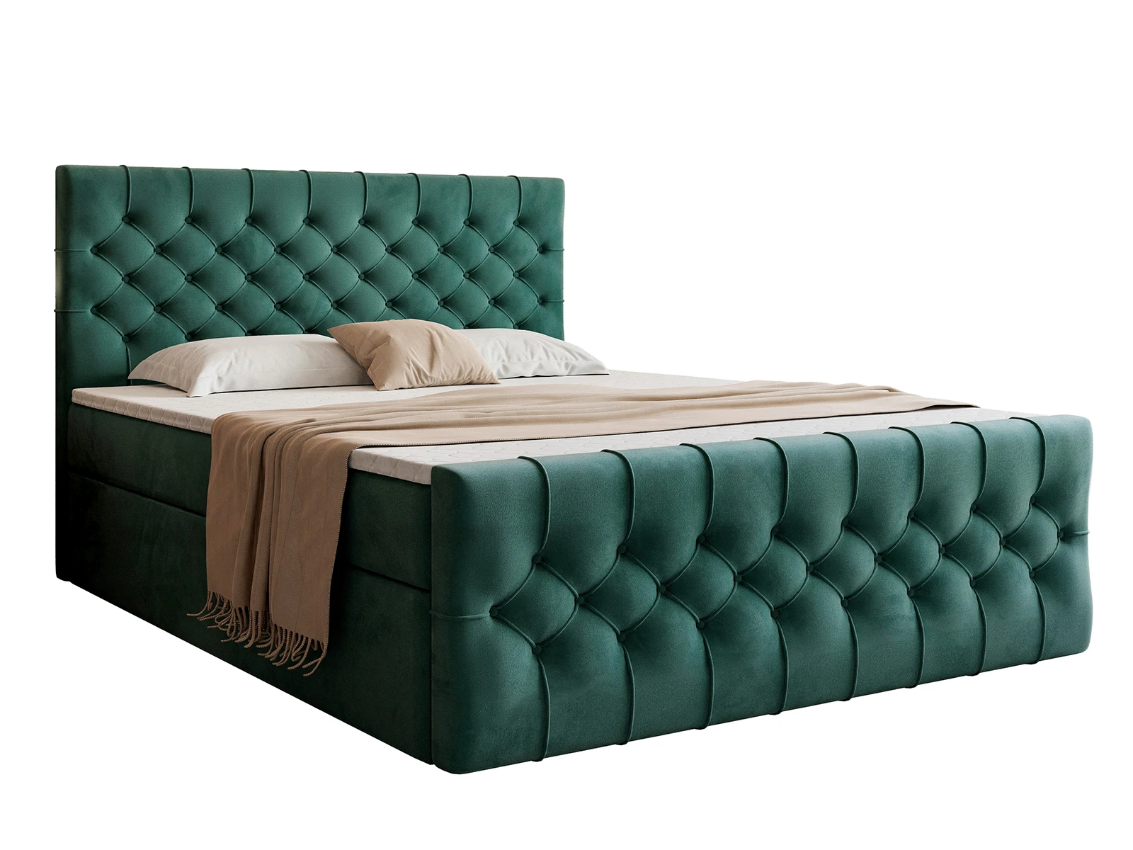 Efektowne, głęboko pikowane wezgłowie oraz front łóżka przyciągają wzrok i podkreślają elegancki charakter mebla, a jednocześnie zapewniają komfortowe oparcie podczas czytania czy relaksu. Solidna konstrukcja gwarantuje stabilność i trwałość na lata, a staranne wykończenie świadczy o wysokiej jakości wykonania.