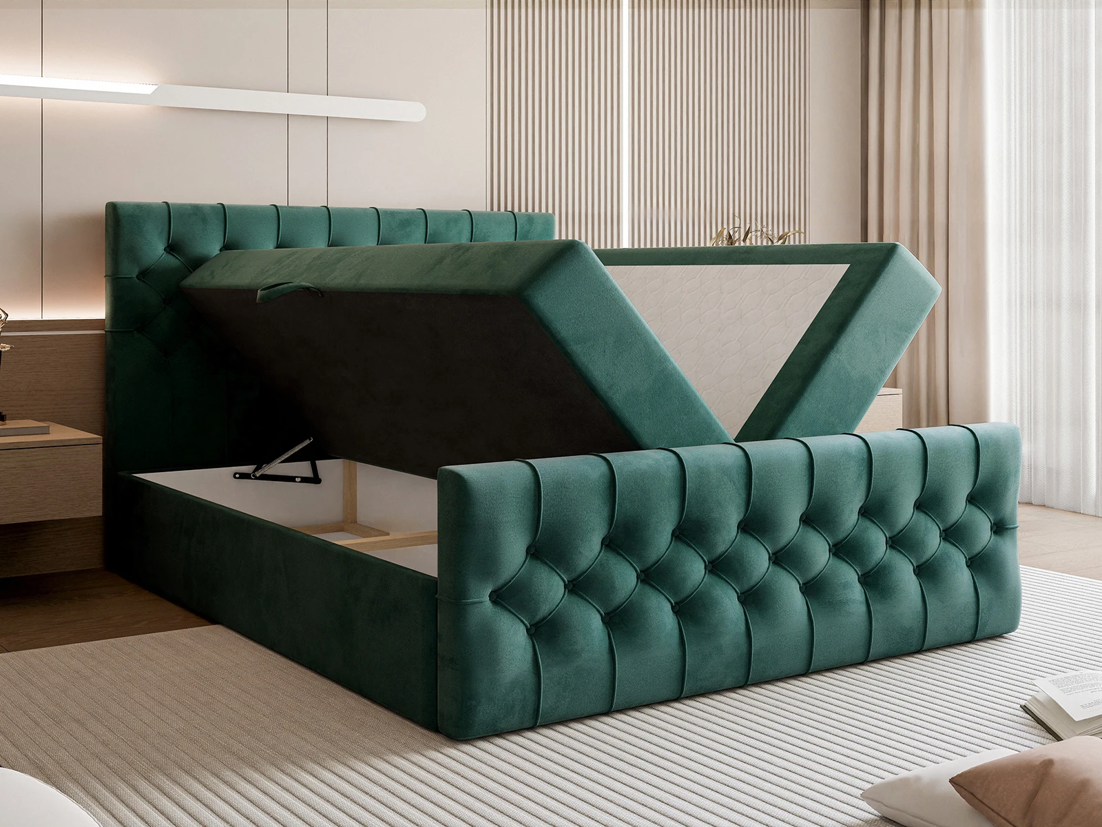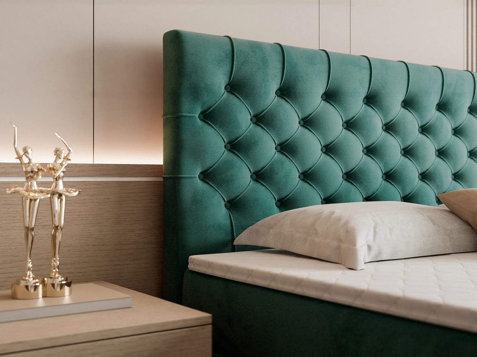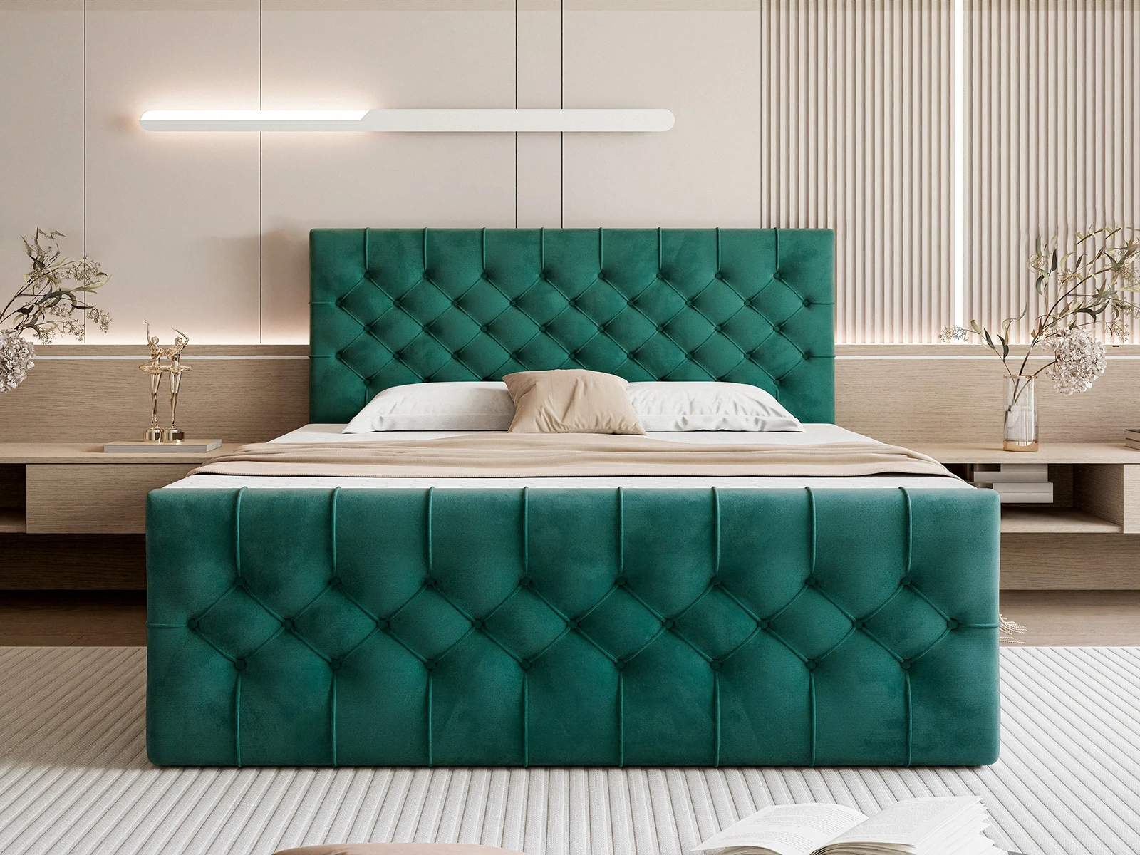 Efektowne, głęboko pikowane wezgłowie oraz front łóżka przyciągają wzrok i podkreślają elegancki charakter mebla, a jednocześnie zapewniają komfortowe oparcie podczas czytania czy relaksu. Solidna konstrukcja gwarantuje stabilność i trwałość na lata, a staranne wykończenie świadczy o wysokiej jakości wykonania.