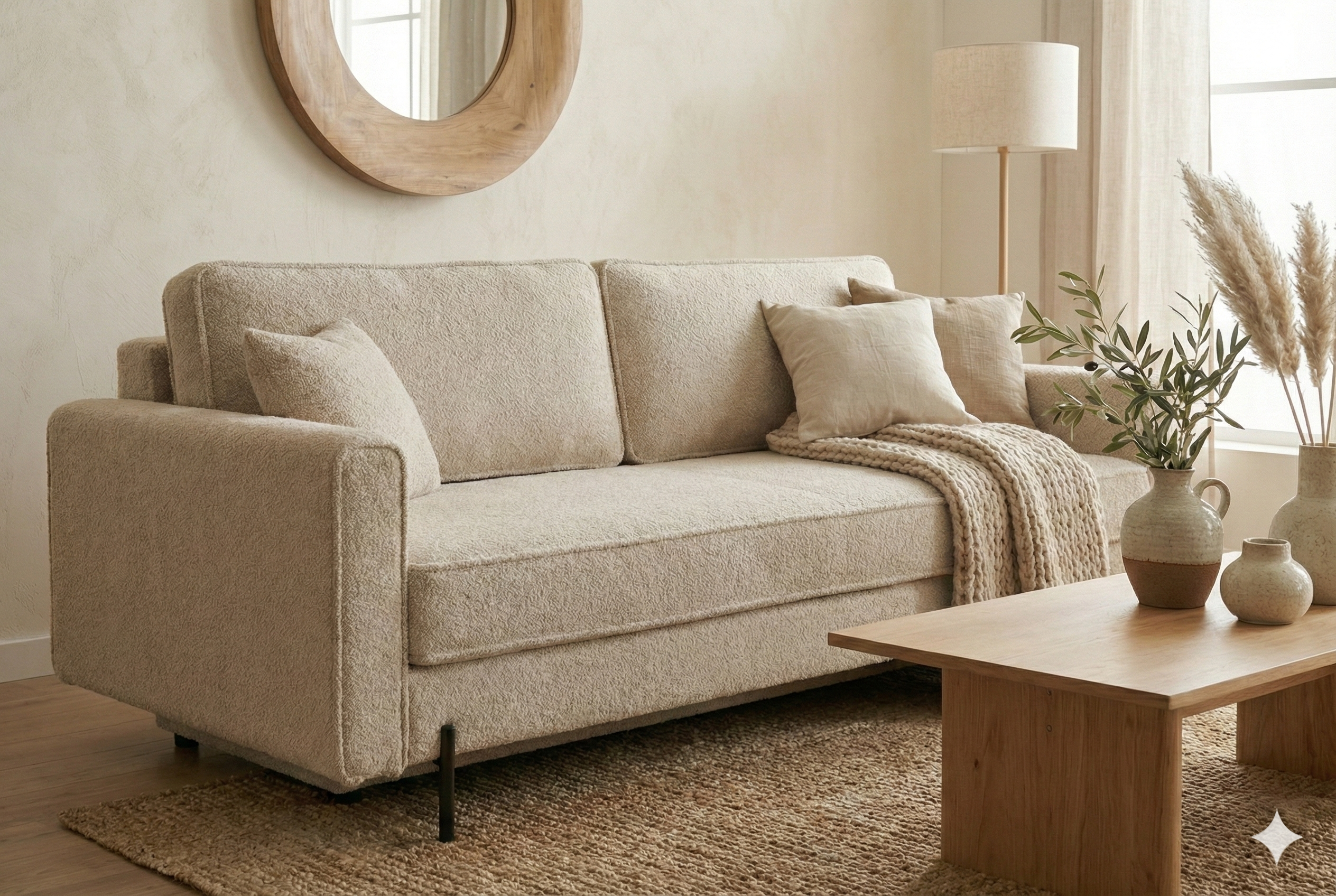 Obszerne siedzisko pozwala zrelaksować się w pozycji siedzącej lub półleżącej. Wnętrze siedziska i oparcia wypełniono sprężyną bonellową oraz pianką poliuretanową, co zapewnia miękkość przy zachowaniu odpowiedniego podparcia. To rozwiązanie wpływa na komfort nie tylko podczas odpoczynku dziennego, ale również w czasie snu.