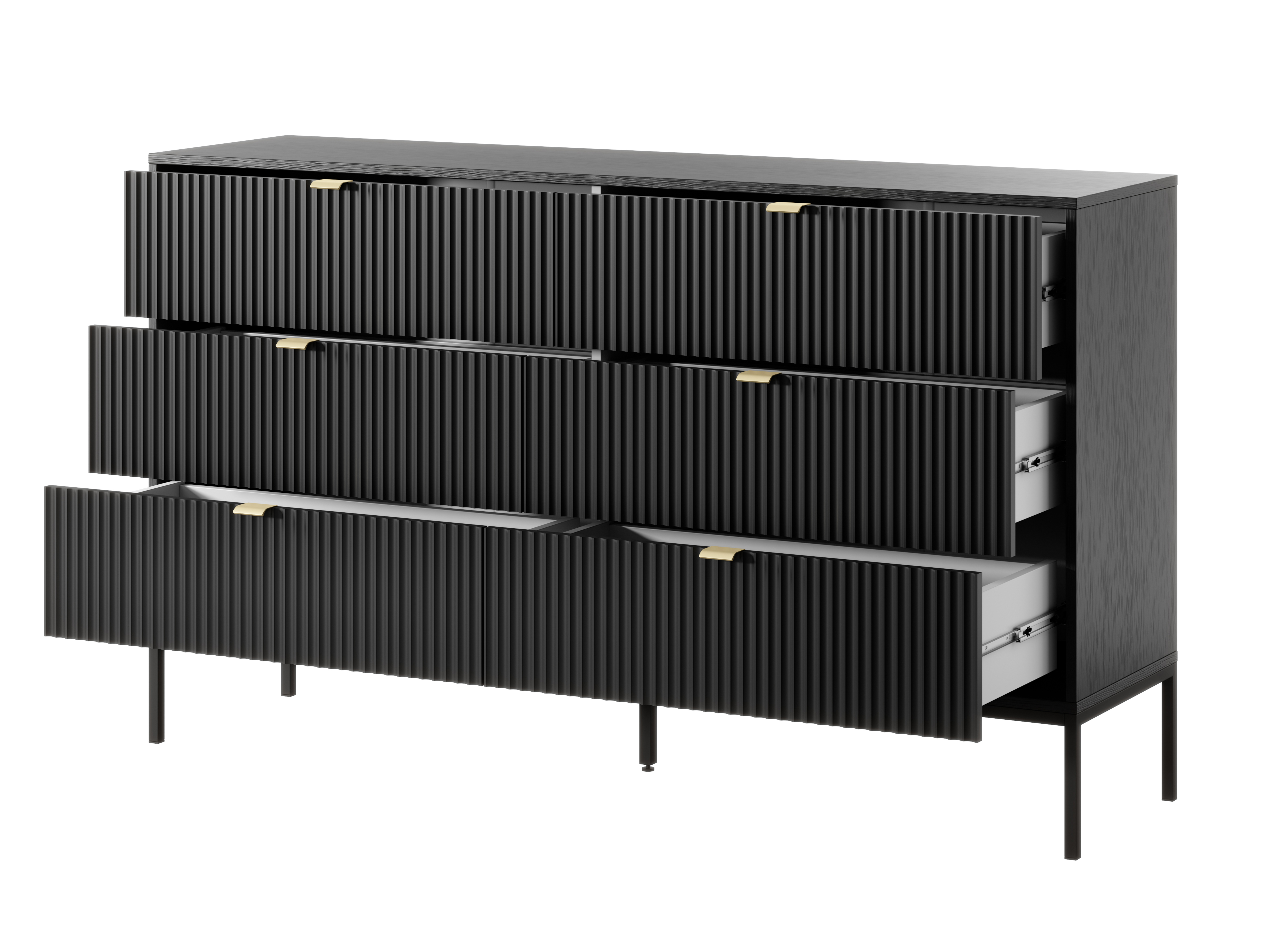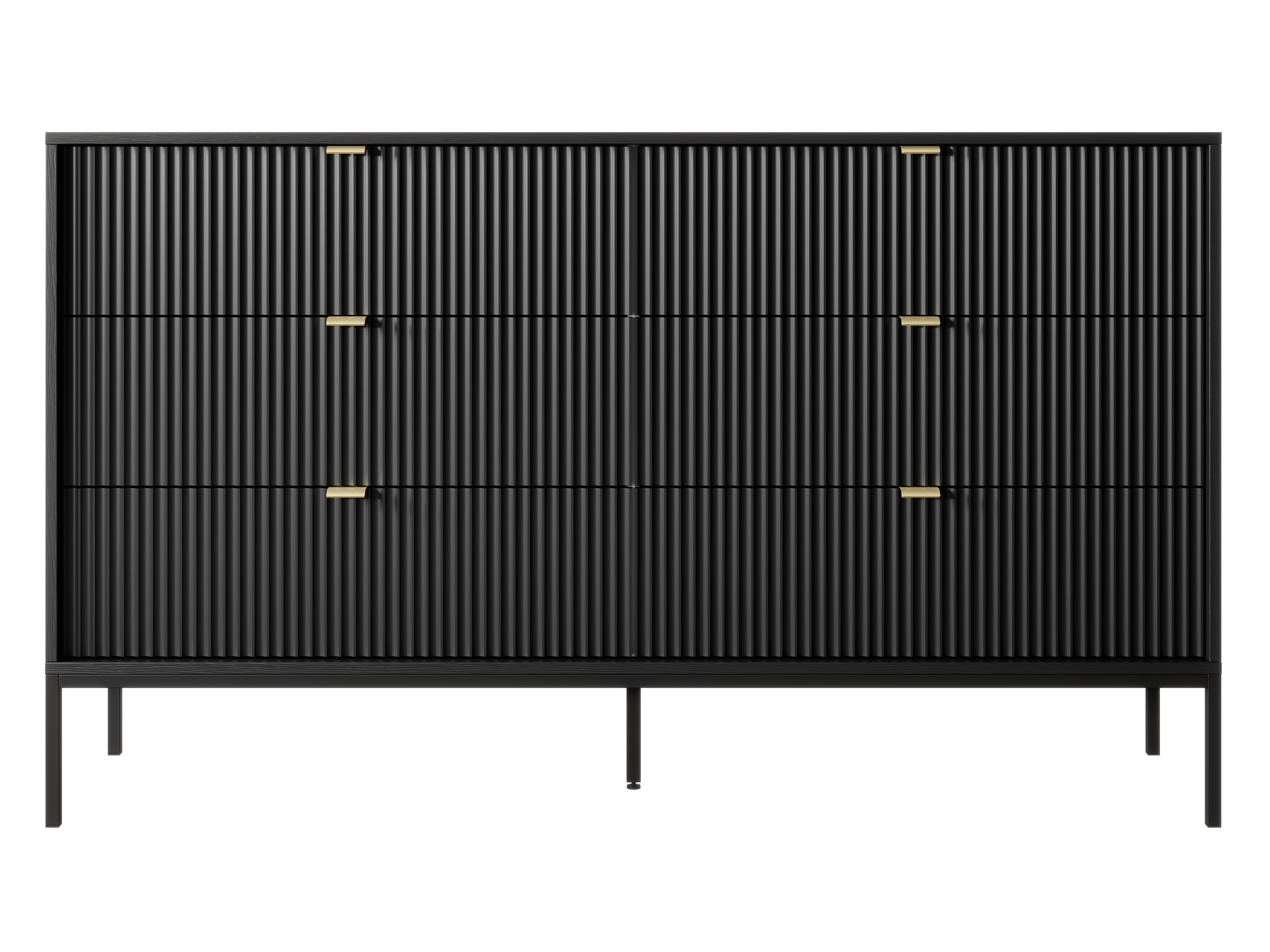 Korpus komody LAMELO został wykonany z pyty laminowanej, ryflowane fronty z płyty MDF. Cała konstrukcję wzmacnia stalowy stelaż malowany proszkowo na kolor czarny.