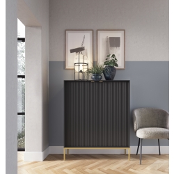 Korpus szafki RTV LAMELO został wykonany z pyty laminowanej, ryflowane fronty z płyty MDF. Cała konstrukcję wzmacnia stalowy stelaż malowany proszkowo na kolor złoty.