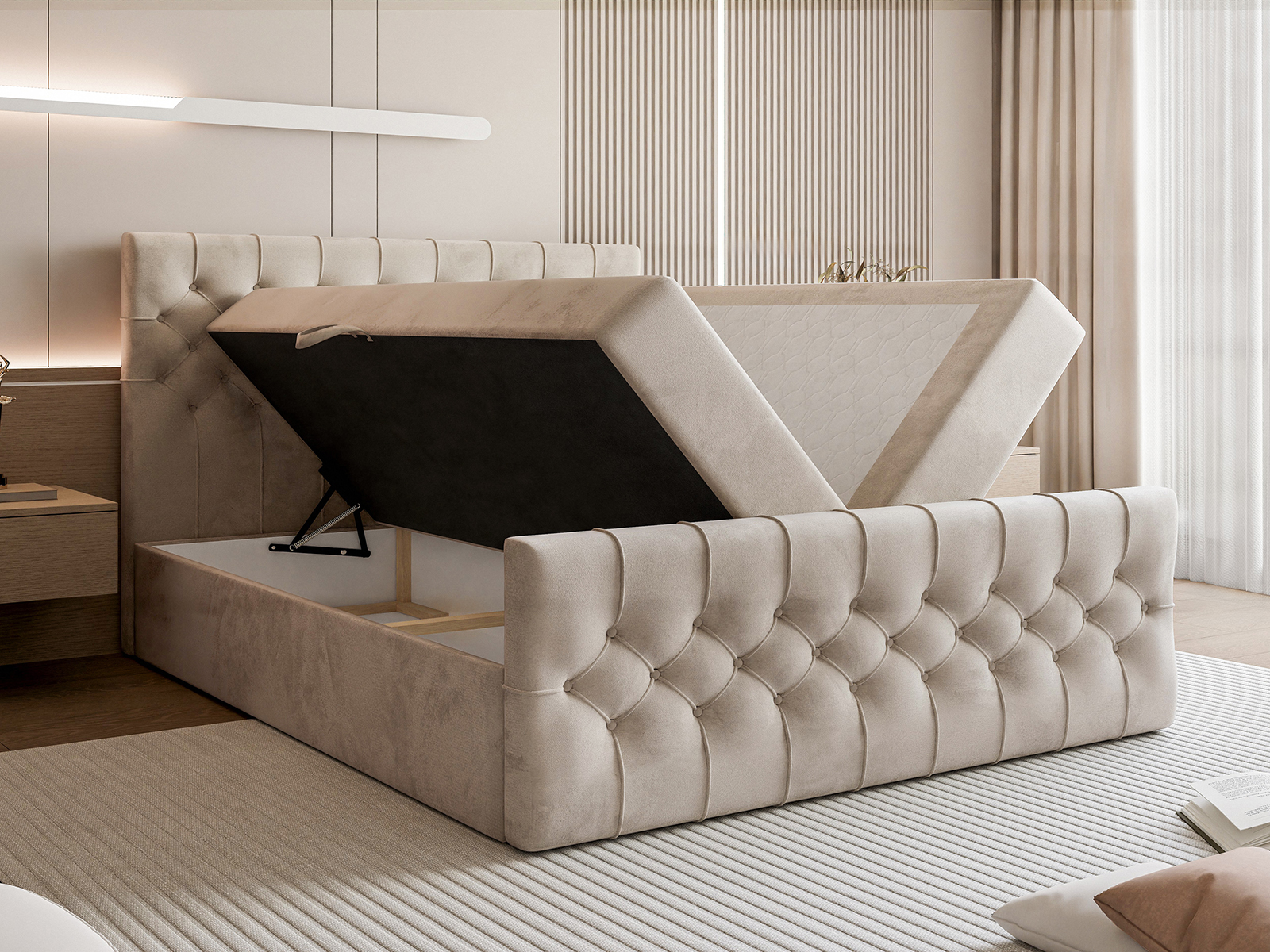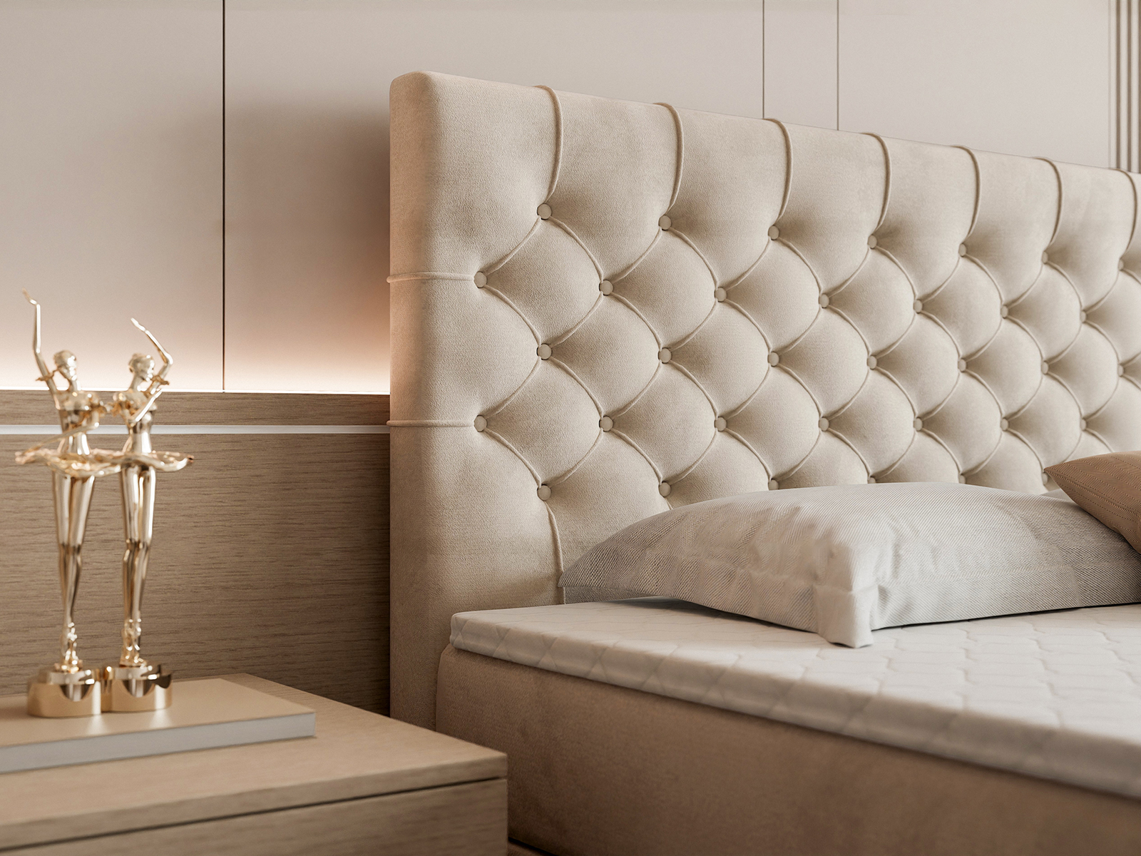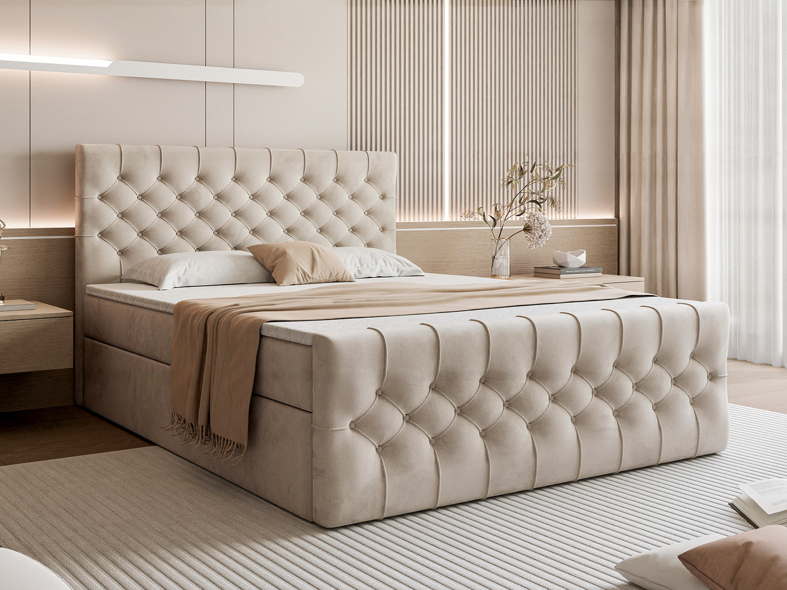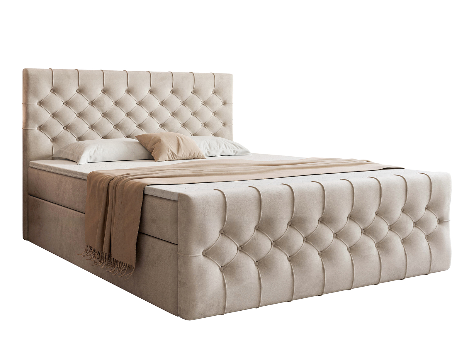 Efektowne, głęboko pikowane wezgłowie oraz front łóżka przyciągają wzrok i podkreślają elegancki charakter mebla, a jednocześnie zapewniają komfortowe oparcie podczas czytania czy relaksu. Solidna konstrukcja gwarantuje stabilność i trwałość na lata, a staranne wykończenie świadczy o wysokiej jakości wykonania.