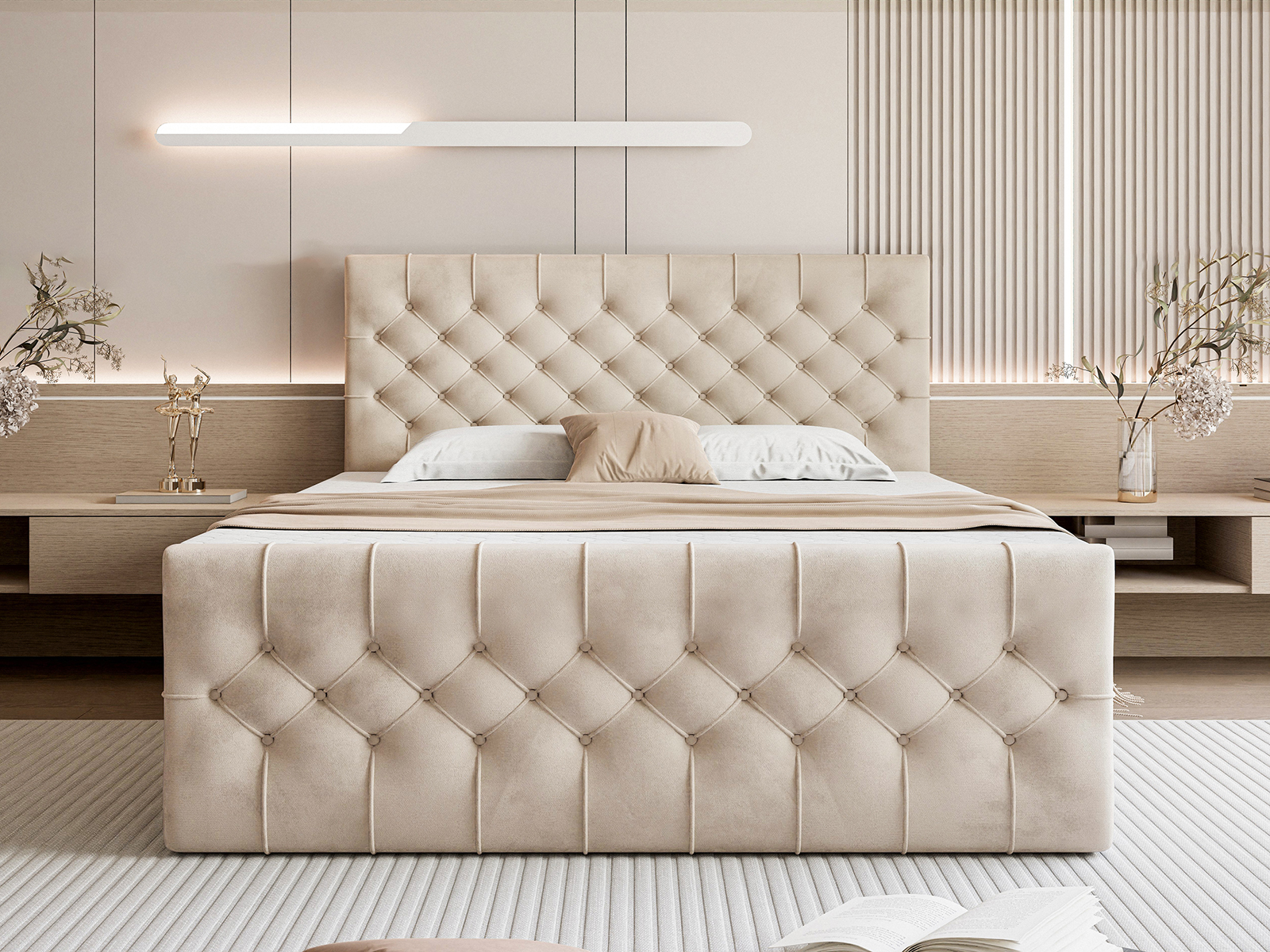 To stylowe łóżko tapicerowane to idealne połączenie luksusowego designu i codziennej wygody. Miękka, przyjemna w dotyku tapicerka w jasnym, neutralnym odcieniu nadaje sypialni ciepła i harmonii, doskonale wpisując się zarówno w nowoczesne, jak i klasyczne aranżacje.