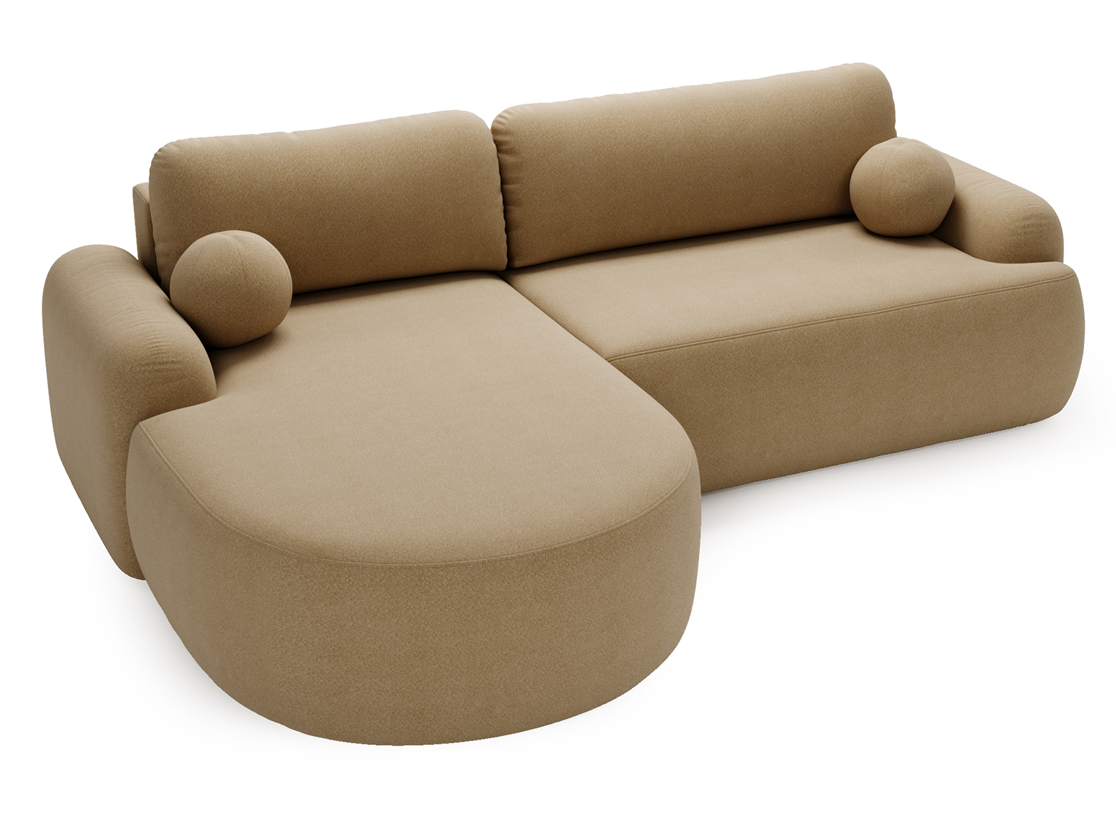 Mebel wykonany w tkaninie Lambi, której pluszowa faktura i dłuższe włosie nadają narożnikowi wyjątkowo przyjemny charakter. Materiał ten jest miękki i otulający w dotyku, dzięki czemu korzystanie z mebla staje się jeszcze bardziej komfortowe. Jego szlachetna struktura dodatkowo podkreśla estetykę narożnika, wprowadzając do wnętrza wrażenie przytulności i ciepła.